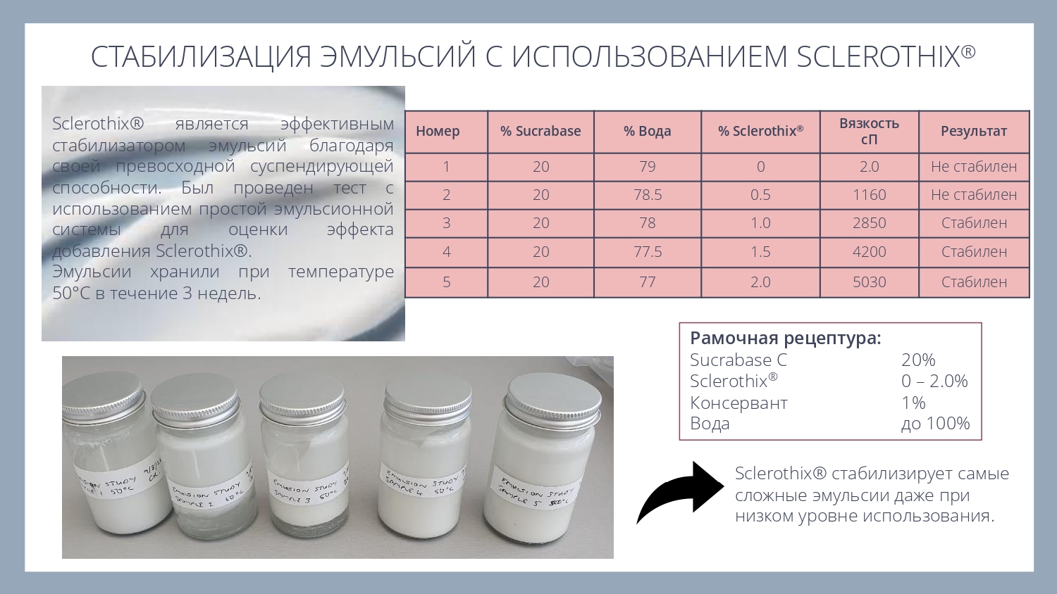 Sclerothix является эффективной добавкой для улучшения суспендирования (подвешивания) различных частиц - скрабов, глин или пигментов, в том числе в составе моющих систем.